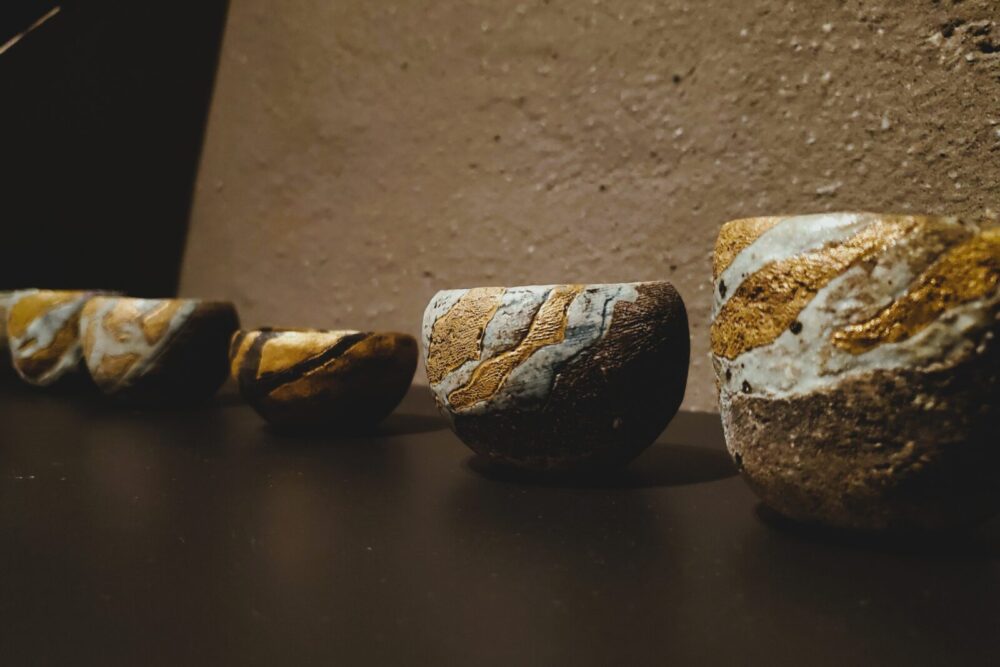 今もなお多彩な表現を探求し続ける宮澤さん。 前回の展示では、内と外の境目がなく、ひと続きになったベースの陶器に顔のオブジェを挿し、一つ一つ命を芽吹かせたシリーズ「imayou(今俑)」を中心にご紹介しました。 今回は、金や銀で自由に彩られたぐい呑や器など新たな表現も並びます。