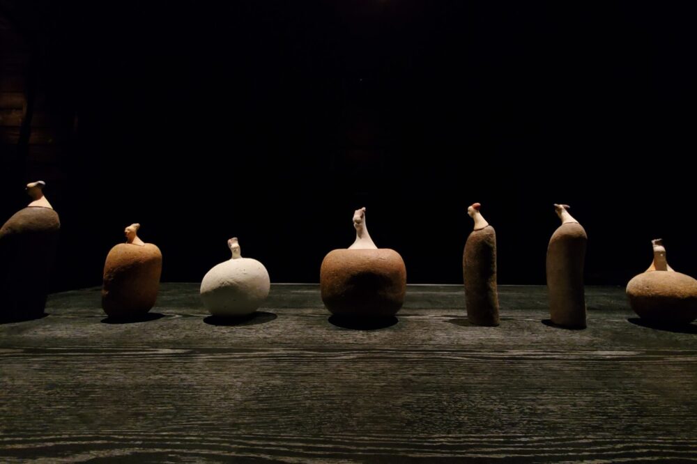 内と外の境目がなく、ひと続きになったベースの陶器に顔のオブジェを挿し、一つ一つ命を芽吹かせたシリーズ「imayou(今俑)」とともに、今回は、金や銀で自由に彩られたぐい呑や器など新たな表現も並びます。手びねりで土を積み重ね、焼けた肌を剥がし磨く独自の技法によって生み出される作品は、幾層もの時間を内に秘めたような、力強さと深みを感じさせます。